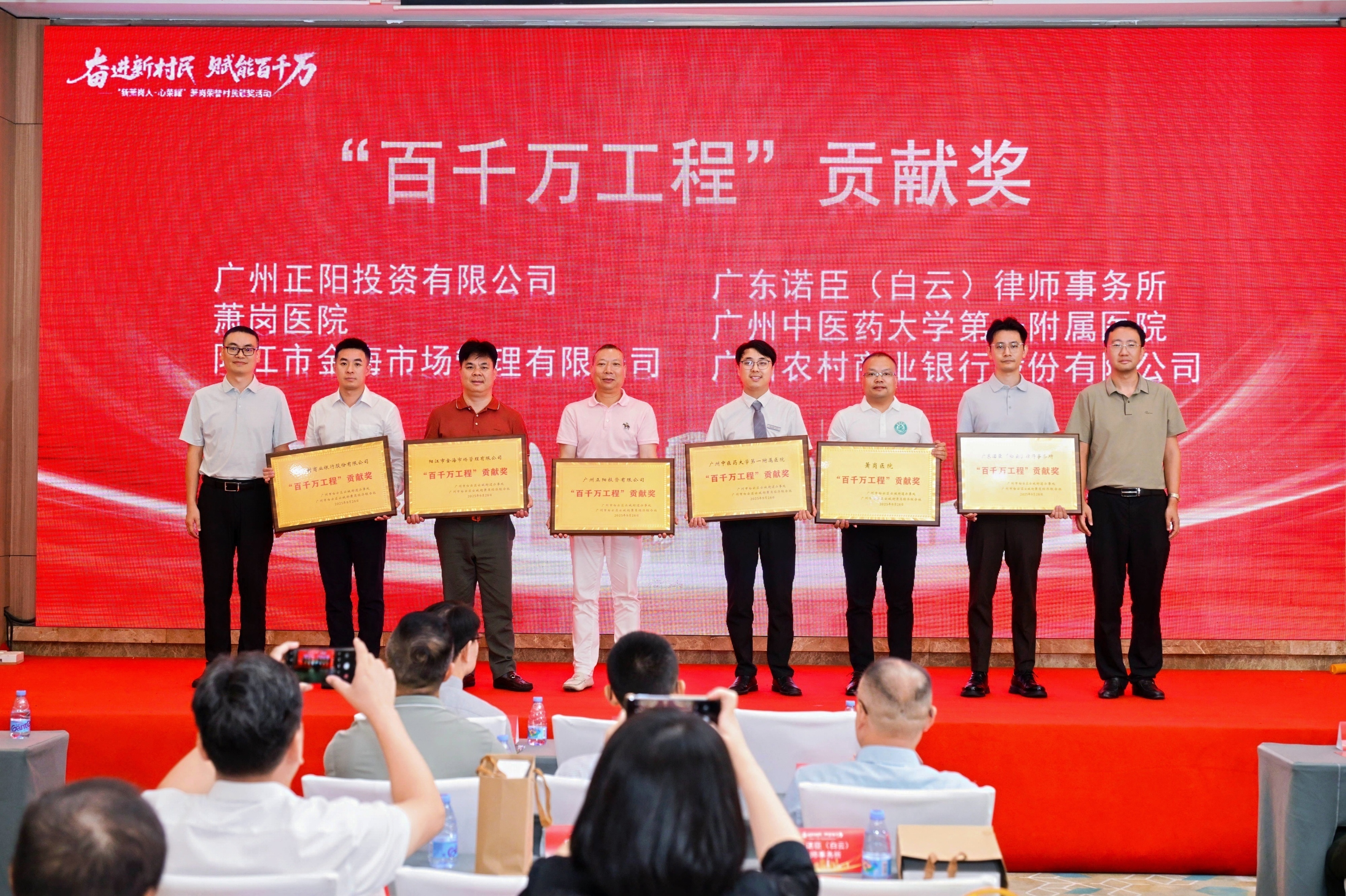 除了个人殊荣,活动还为在“百千万工程”中发挥重要作用的6家单位颁发了贡献奖。对在产业发展、公共服务、社区治理、法律与医疗支持等方面给予了萧岗坚实支撑的阳江市金海市场管理有限公司、广州正阳投资有限公司、广州中医药大学第一附属医院、萧岗医院、广东诺臣(白云)律师事务所及广州农村商业银行股份有限公司共6家单位,授予“百千万工程”贡献奖。